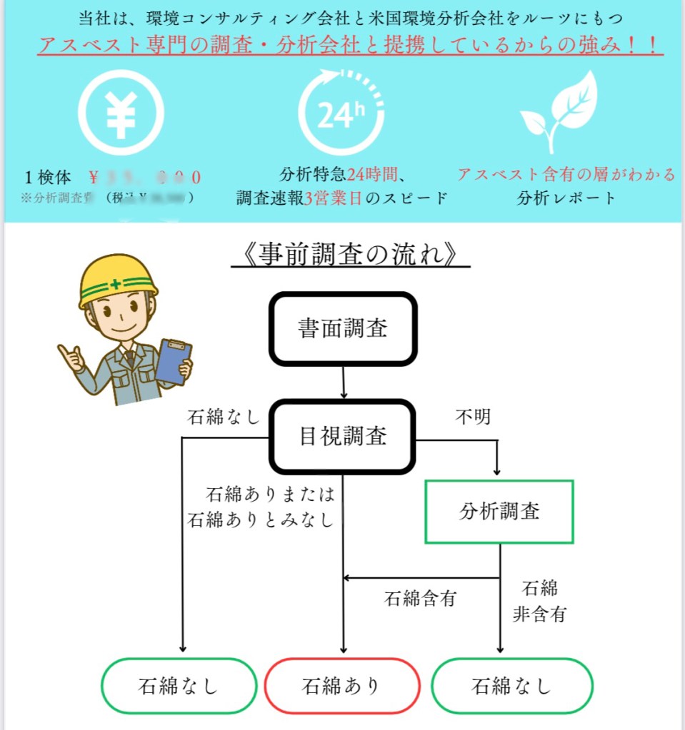 当社が扱う解体工事や改修工事・リフォーム工事の際アスベスト事前調査に行うサンプル採取を行い分析会社に頼みますが当社はアスベスト専門の調査会社・分析会社へ提携していますので安心・速さ・確実の絶大な信用があります。